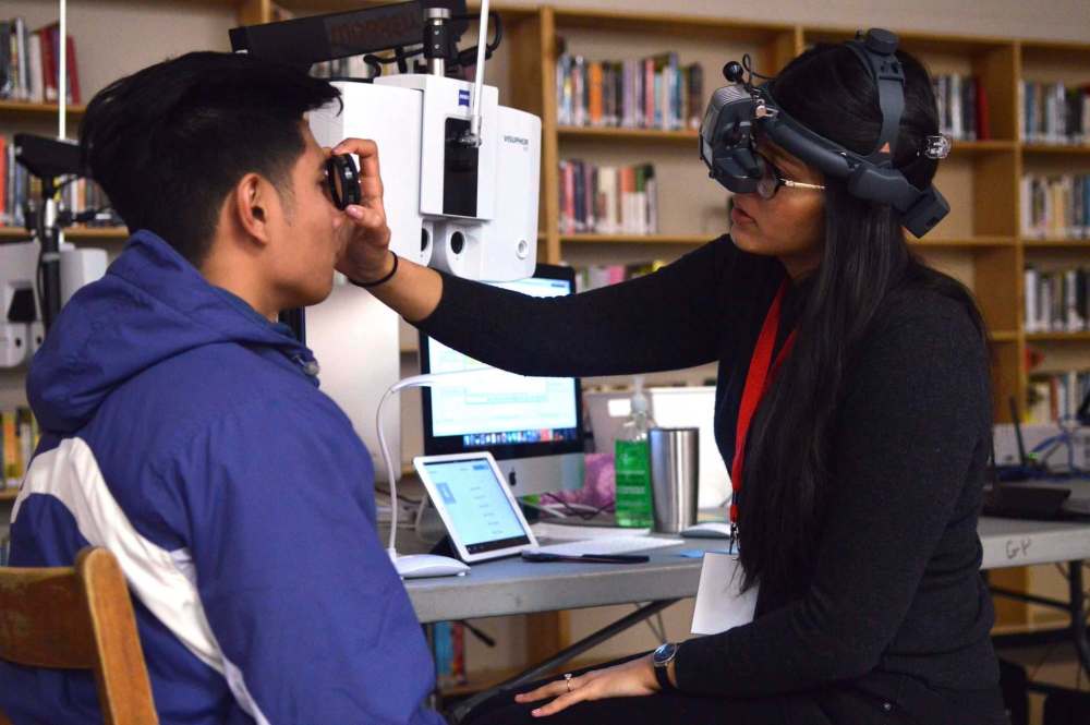 Mobile Vision Care Clinic optometrist Sonal Trivedi examines a student’s retina. The clinic travels to schools to ensure students, regardless of circumstance, are able to access eye care.