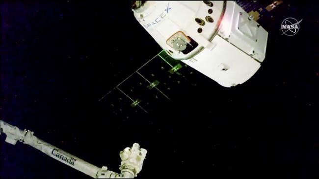 The Dragon capsule pulled up at the orbiting lab three days after launching from Cape Canaveral. Commander Alexander Gerst used the space station’s big robotic arm to grab the cargo carrier, as the two craft soared 250 miles above the Pacific.