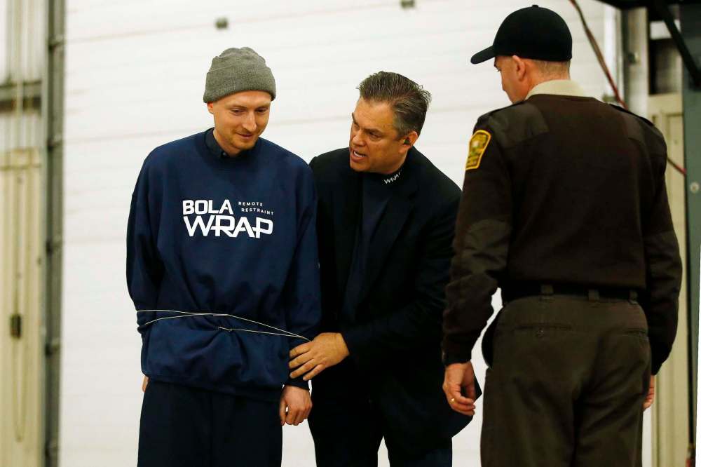 Wrap Technologies president Tom Smith held a demonstration of the BolaWrap, a restrain tool developed to demobilize subjects while keeping a safe distance between them and the officer, Thursday night in Winnipeg.