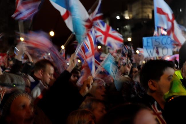 There was no such restraint in nearby Parliament Square, where arch-Brexiteer Nigel Farage gathered a crowd of several thousand, who belted out the patriotic song “Land of Hope and Glory” as they waited for the moment that even Farage sometimes doubted would ever come.