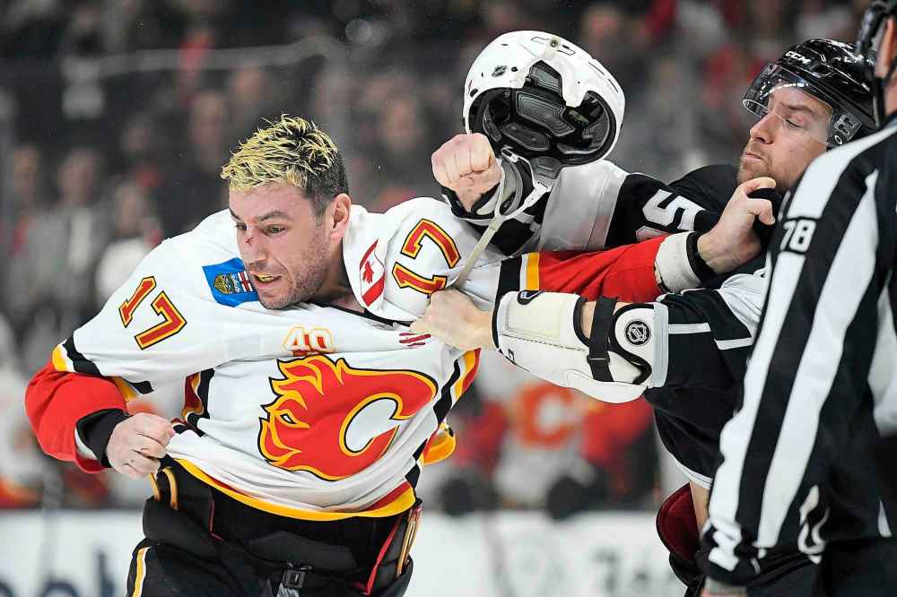 Calgary's Milan Lucic and Los Angeles's Kurtis MacDermid take part in one of the projected 222 fights that will occur this season. (Mark J. Terrill / The Associated Press files)