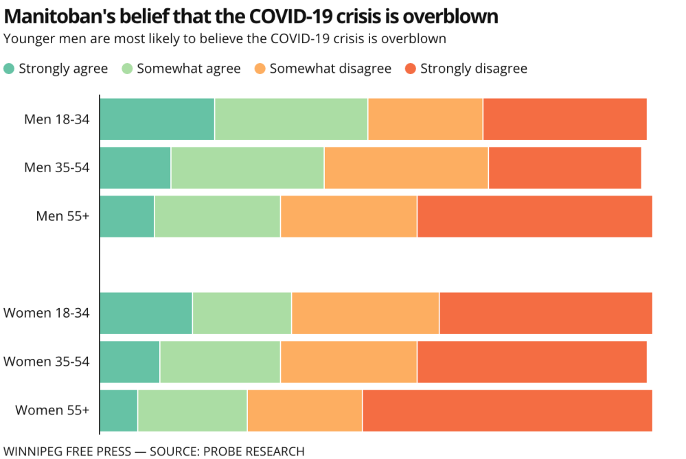 Nearly half of male Manitobans aged 18 to 34 agreed the COVID-19 issue is “overblown” in Canada; by comparison, just 35 per cent of women in the same age bracket agreed.