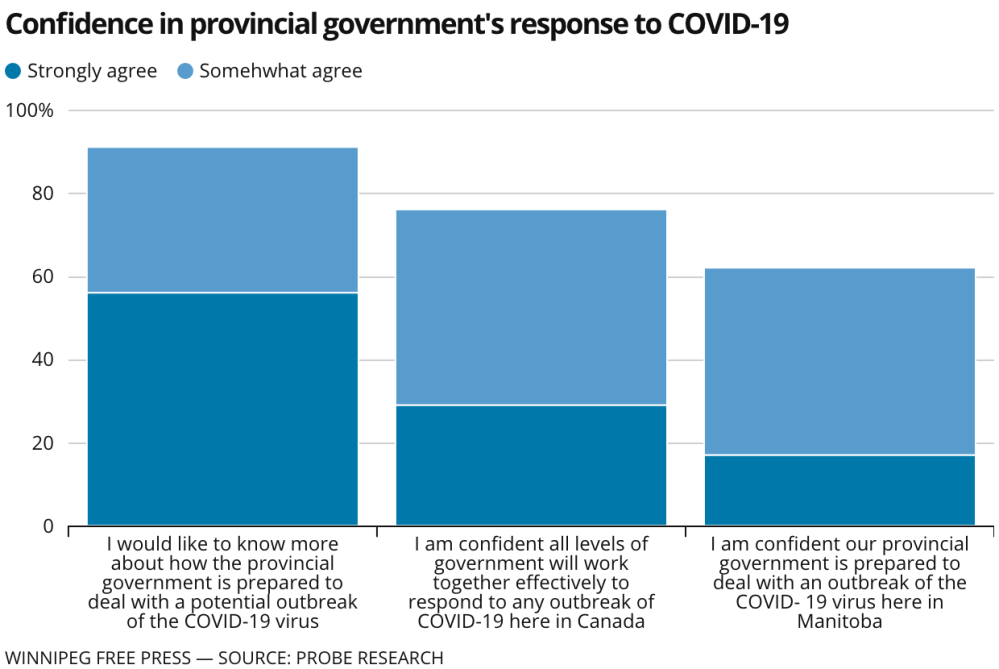 On the subject of the province’s capacity to respond to an outbreak of the novel coronavirus in Manitoba, about two-thirds (62 per cent) expressed some level of confidence in the government.