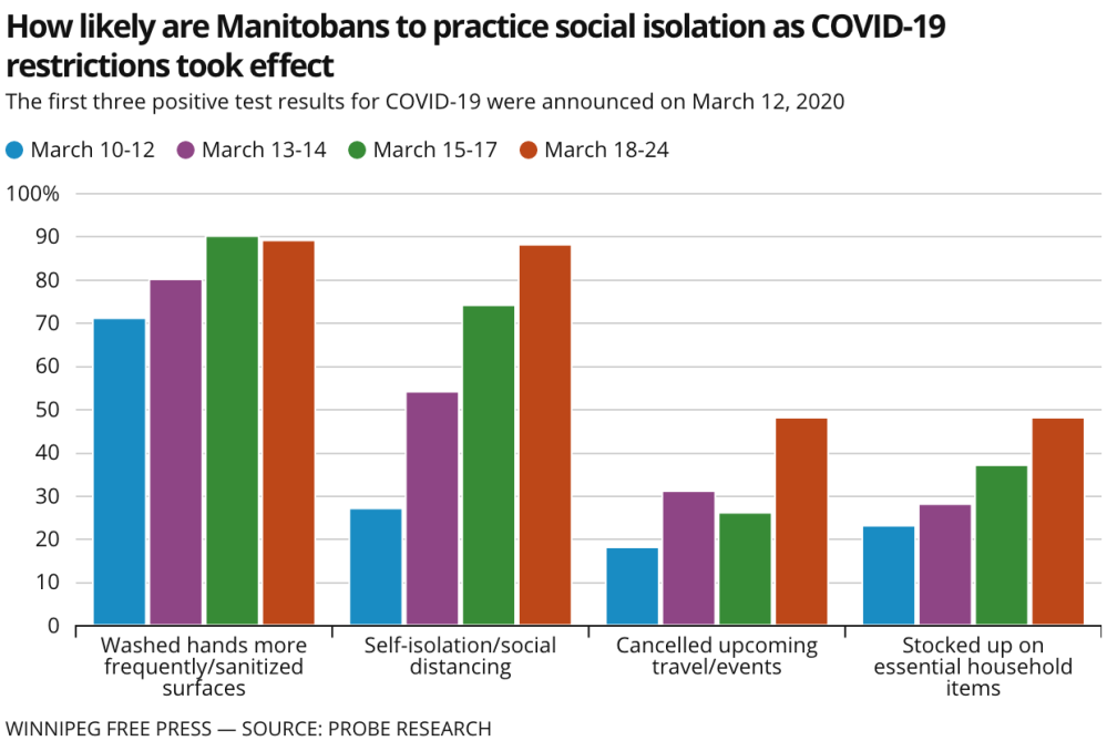 Further, about one in 10 adult Manitobans have not changed their behaviour to include any social-distancing recommendations, including increased hand washing, physical distancing and isolation, and cancelling non-essential travel amid pandemic, according to data collected by Probe Research.