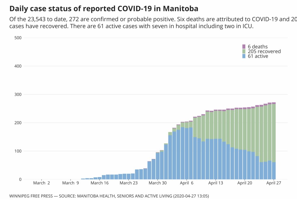 "Our numbers have been stable and reflective of Manitobans’ efforts at maintaining and flattening this curve," he said after one new case was reported Monday — the 29th Manitoban to test positive in the last 14 days, Roussin noted.