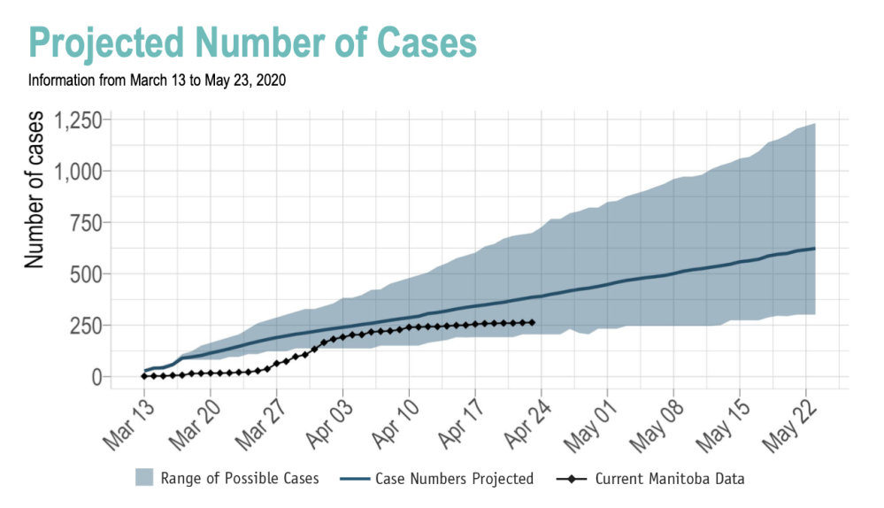 Roussin said Manitoba could reach 500 cases by May 8. The current caseload sits below projected numbers — with 273 cases recorded on Wednesday — but is still within the range of possibility.