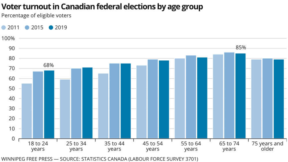 Neither expert would directly link the payouts to seniors to voting patterns. However, in last fall’s federal election, 85 per cent of voters aged 65 to 74 cast a ballot, compared with 68 per cent of those aged 18 to 24.