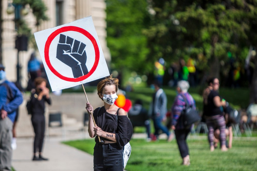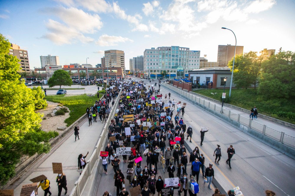 In Winnipeg, demonstrators gathered en masse despite public health orders limiting outdoor crowds to 50 people. Some wore non-surgical masks, many held signs: “No bigger virus than racism.” “White silence = violence.” “Police the police.” “Same shit, different country. I’m tired.” “Get yo knee off my neck.” “End police terror.”