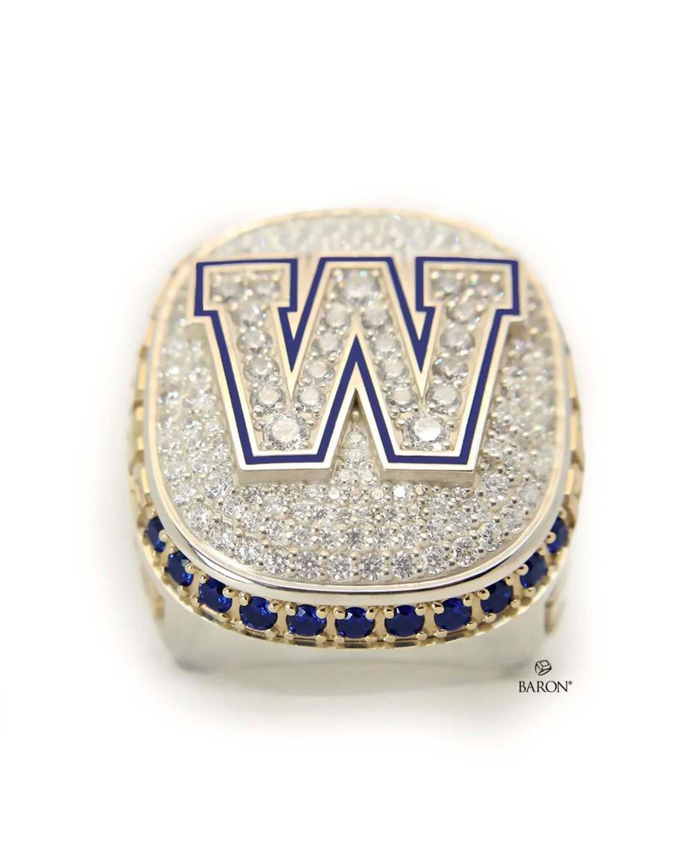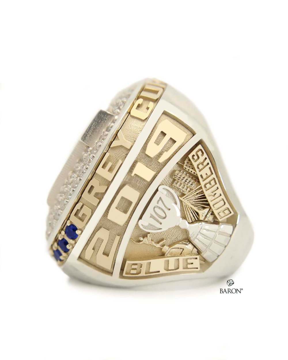 On the top there is a ‘W’ in diamonds and custom Bombers blue enamel. The outer edge of the face is lined with 11 sapphires representing the organization’s total championship wins and is complemented by the title “Grey Cup Champions.”