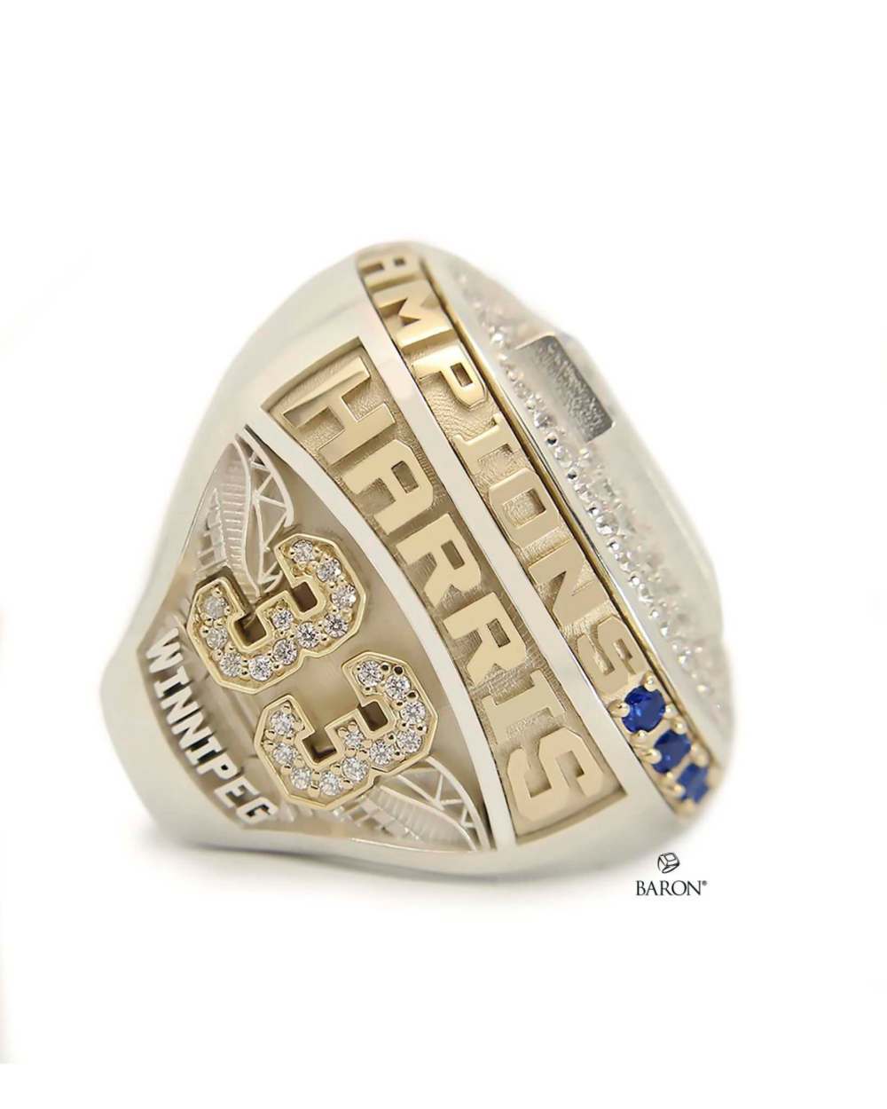 Both shoulders of the ring feature intricate details. One shoulder displays the player’s name and number in diamonds over the IG Field background, while the opposite shoulder features the Winnipeg skyline behind the Grey Cup and the Golden Boy, framed by the team name and year.