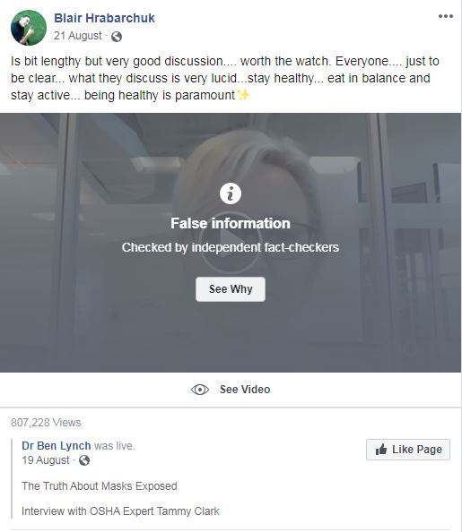 In August, Hrabarchuk shared a post that Facebook fact-checkers flagged as false information about the pandemic.  (Facebook)