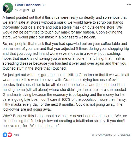 Hrabarchuk also posted links to several YouTube videos that promote conspiracy theories, including some that claim masks do not help reduce the transmission of viruses. One of those videos has since been fact-checked by Facebook and labelled “false information.”