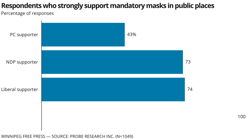 Political beliefs may also play a role: only 43 per cent of respondents who were strongly in favour of mandatory masks were Progressive Conservative party supporters, compared with 74 per cent and 73 per cent who supported the Liberals and NDP, respectively.