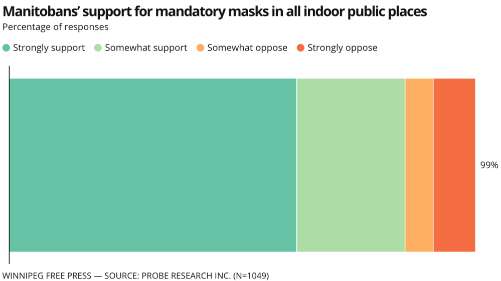 The survey of 1,049 Manitobans, which was conducted over 10 days in August, found women, Winnipeg residents and university graduates were more likely to support mandatory masks than were men, people who live outside the capital, and those with lower levels of education.