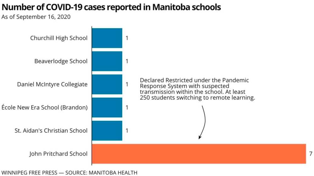 Classes resumed Sept. 8 and the virus has shown up at several Manitoba schools, with one case each at New Era School in Brandon, Winnipeg’s Churchill High School, Daniel McIntyre Collegiate, Beaverlodge Elementary, St. Aidan’s Christian, and now seven cases at John Pritchard School.