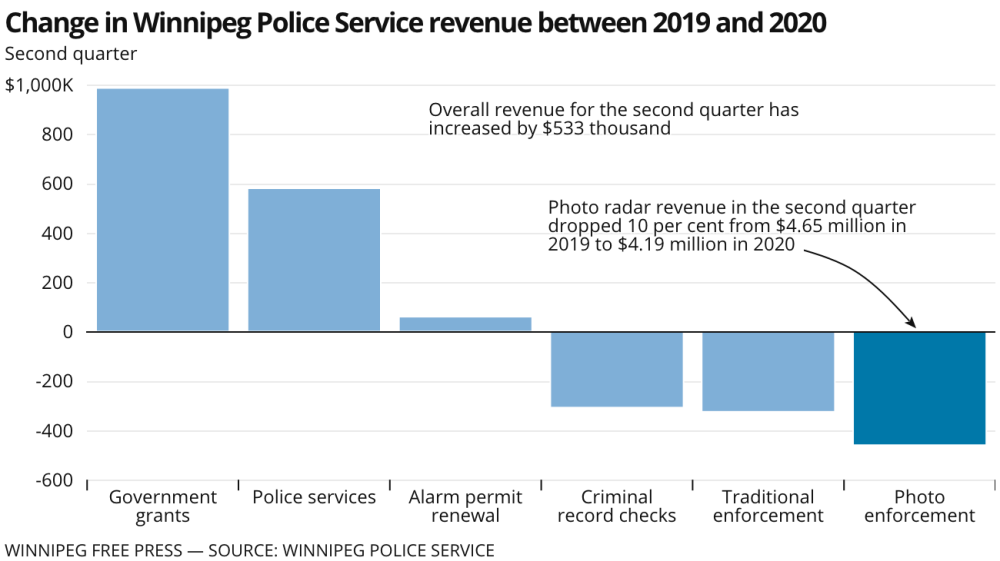 According to the second-quarter WPS budget, which will be brought to the Winnipeg Police Board on Thursday, photo radar revenue has dropped 10 per cent — from $4.65 million in 2019 to $4.19 million in the same period of 2020 — and is projected to come in nearly $5 million under budget by year’s end.
