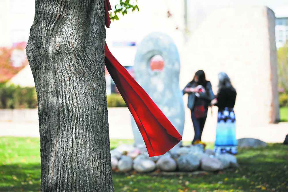 Red dresses draped on trees and red ribbons tied to handrails and bridges stood in stark contrast to blustery grey skies Sunday — signs of respect for Indigenous women who have gone missing or been slain in Manitoba.