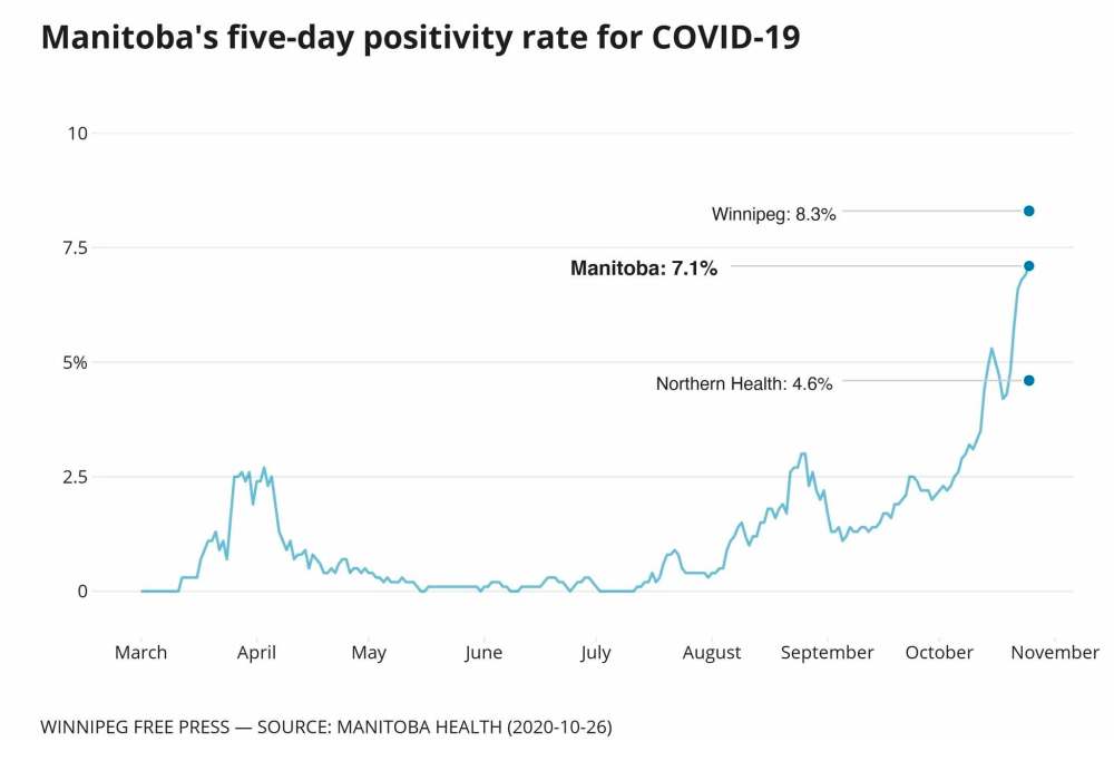 Chief public health officer Dr. Brent Roussin announced a provincewide test positivity rate of 7.1 per cent Monday. The number in Winnipeg was 8.3 per cent and 4.6 per cent in the Northern health region.