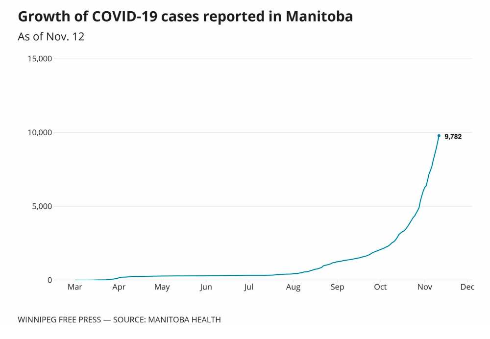The total number of cases reported in Manitoba since March reached 9,782, with 6,030 considered to be active, though there is a backlog in reporting recoveries. (Roussin said the number of active cases is closer to 3,200.)
