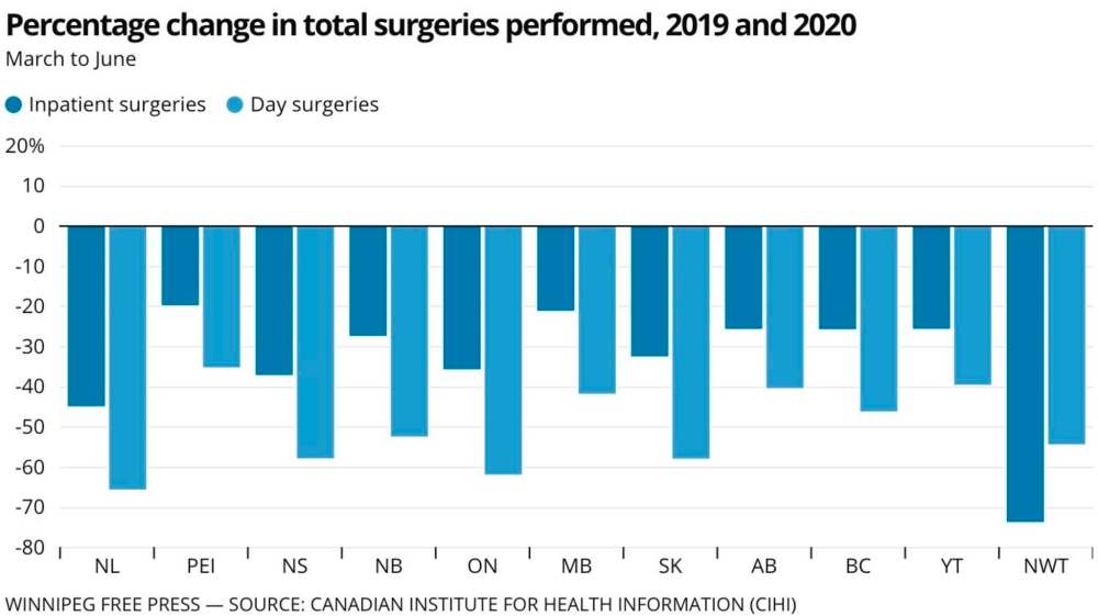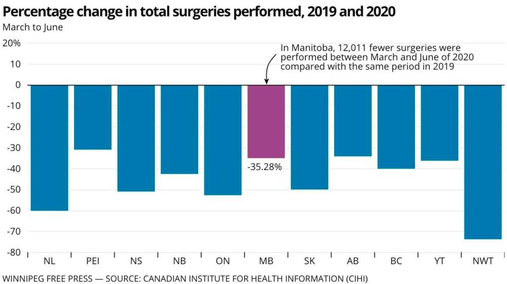 In an analysis of data provided by the Manitoba government, the Canadian Institute for Health Information found the province had 12,000 fewer surgeries between March and June of this year compared with the same time frame a year prior.