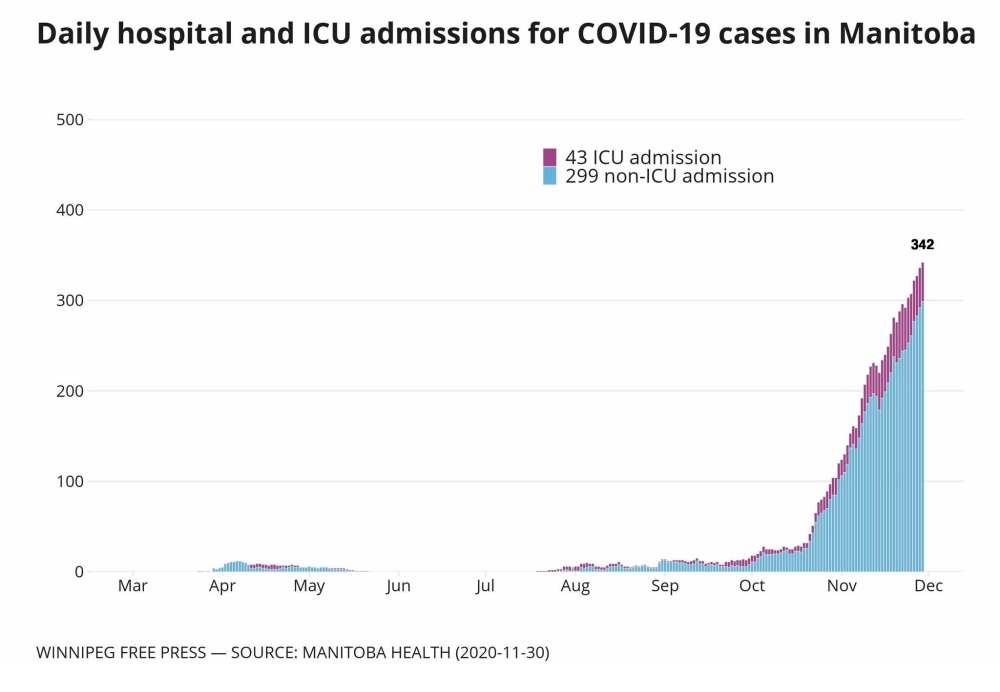 There were 341 COVID-19 patients in hospital in Manitoba, including 43 in intensive care; 31 of 70 patients on ventilators had COVID-19.