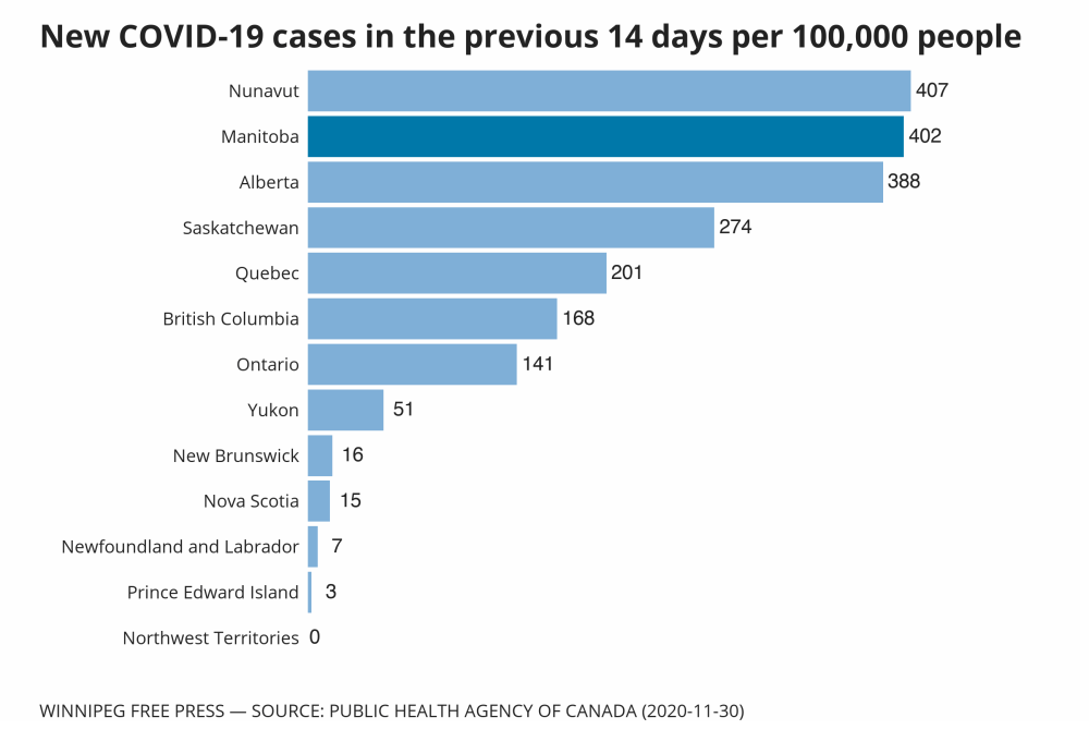 Alberta has surpassed Manitoba for the highest seven-day case count per capita in Canada, at 219 per 100,000 people (compared to Manitoba’s 215). The daily number of new COVID-19 cases in Alberta has been climbing steadily since early October. The province hit a record 1,731 on Nov. 28.