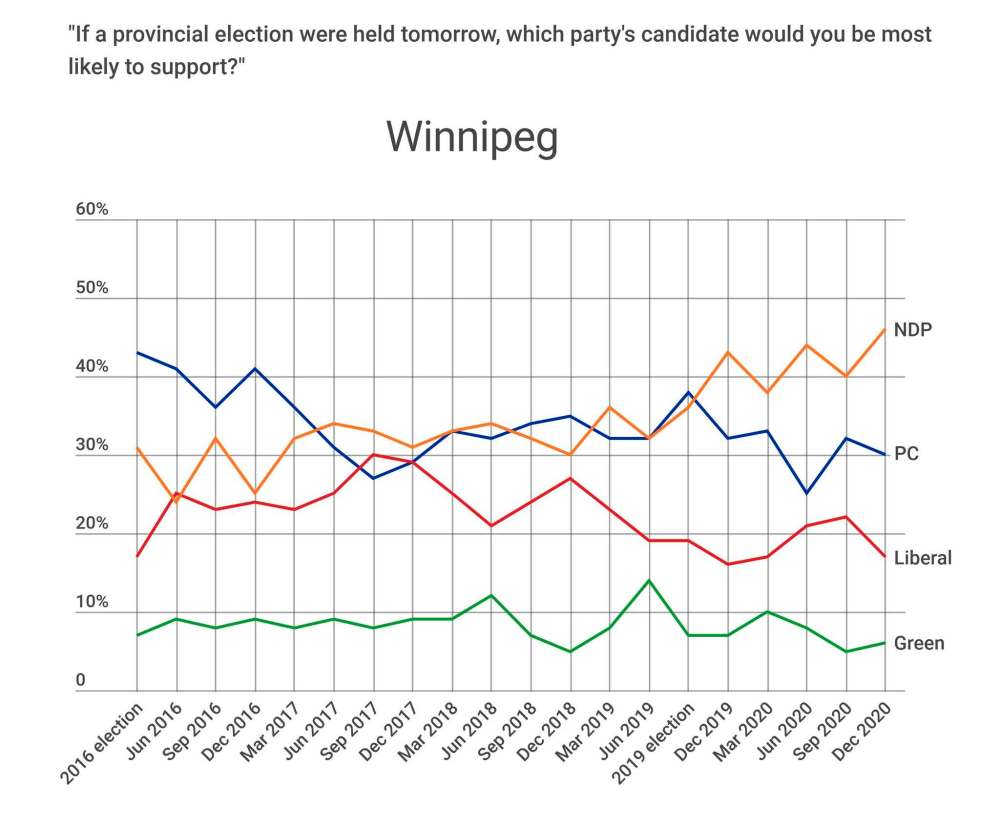 The poll shows that in Winnipeg, the NDP has a 16-point lead, at 46 per cent support, compared with the PCs at 30.