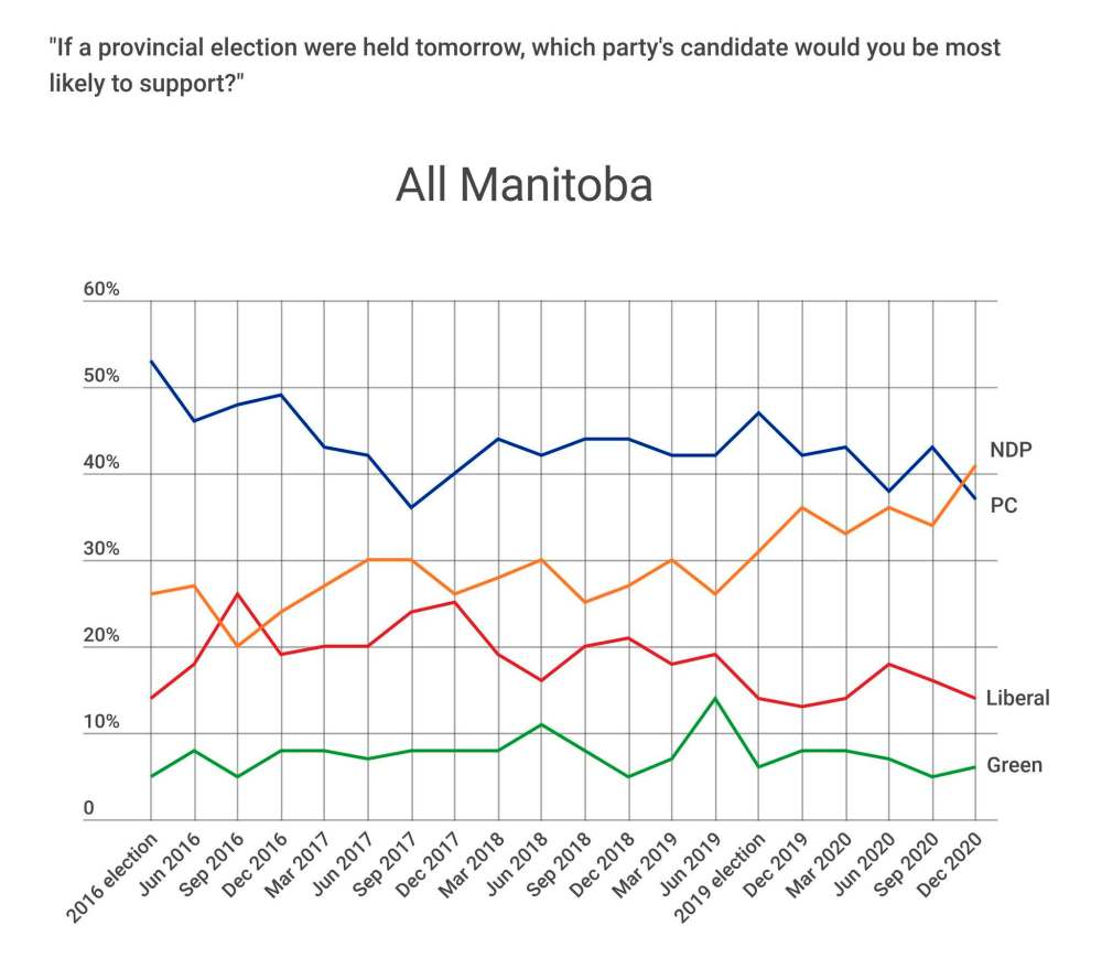 The firm questioned 1,000 Manitobans from Nov. 24 to Dec. 4, and found the NDP leading with 41 per cent, overtaking the PC party’s 37 per cent support. That’s a 10-point drop from the support Premier Brian Pallister garnered when his government was re-elected in fall 2019.