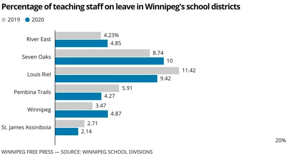 In River East Transcona, which employs upwards of 1,300 educators, 63 people went on leave in 2020. Last year, 55 took an absence of some kind.