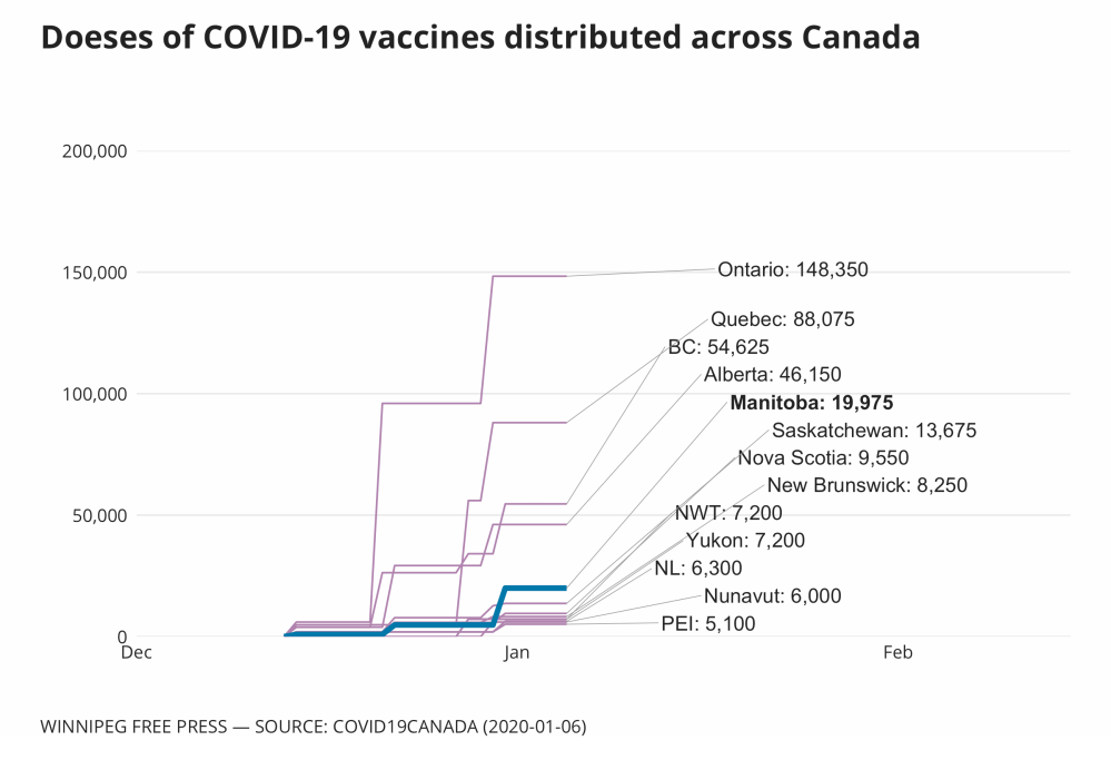 To date, Manitoba has received a total of 22,230 doses of the Pfizer vaccine, which includes approximately 7,000 doses delivered Tuesday. As of Wednesday morning, 5,165 people had been immunized with the Pfizer vaccine. There are currently about 17,000 doses of Pfizer in the province, which will be used for the remainder of this week’s immunizations (5,250) as well as the 6,650 appointments for first- and second-dose immunizations that will be scheduled at the super site next week.