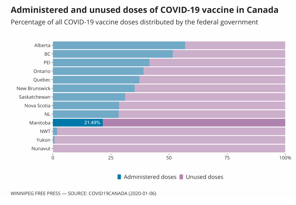 While Manitoba has lagged behind all other provinces in the number of vaccinations delivered compared to available supplies, Pallister said as of Wednesday morning the province was fifth in that regard.