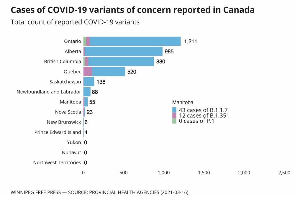 Fourteen new cases involving variants of concern — 13 of the U.K. variant and one of the South Africa variant (B.1.351) — have been detected in Manitoba, all of them in the Winnipeg health region, provincial health officials announced Tuesday. Those cases had been previously announced in daily provincial case counts, but the process through which positive COVID-19 results are screened to check for variants takes roughly a week to 10 days.