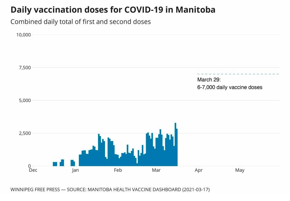 On March 9, Manitoba government projected 118,205 doses would be administered over the following 28 days (average 4,222 per day) based on expected supply.