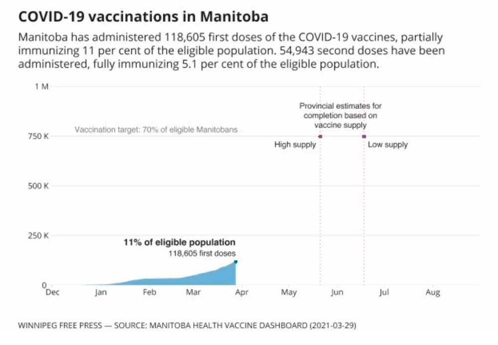 Under a high-supply scenario, the province said it would be able to immunize all adult Manitobans with a single dose of vaccine by May 21. With lower, or irregular supply, that timeline was extended to mid-June.