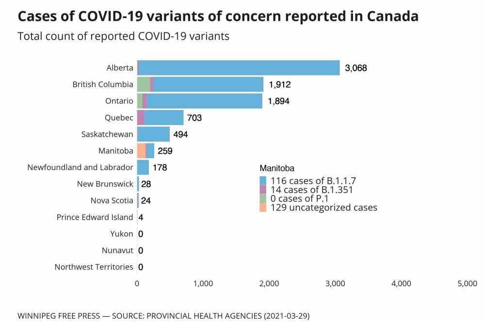 Chief provincial public health officer Dr. Brent Roussin said the province will now report the number of cases determined to be caused by variants of concern, after screening by Cadham Provincial Laboratory.