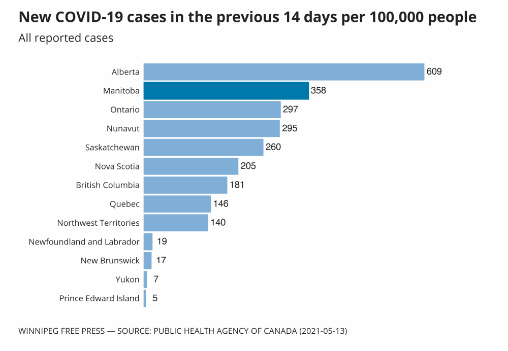 Only Alberta has had higher case counts per 100,000 people over the past two weeks (609, compared to 358 in Manitoba).