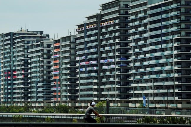 A man rides his bike near the athlete's village for the 2020 Summer Olympics and Paralympics, Thursday, July 15, 2021, in Tokyo. (AP Photo/Jae C. Hong)