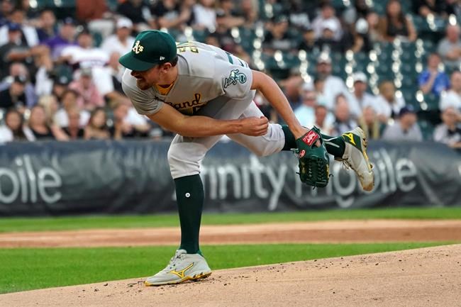 Oakland Athletics starting pitcher Chris Bassitt follows through during the first inning of a baseball game against the Chicago White Sox, Tuesday, Aug. 17, 2021, in Chicago. (AP Photo/Charles Rex Arbogast)