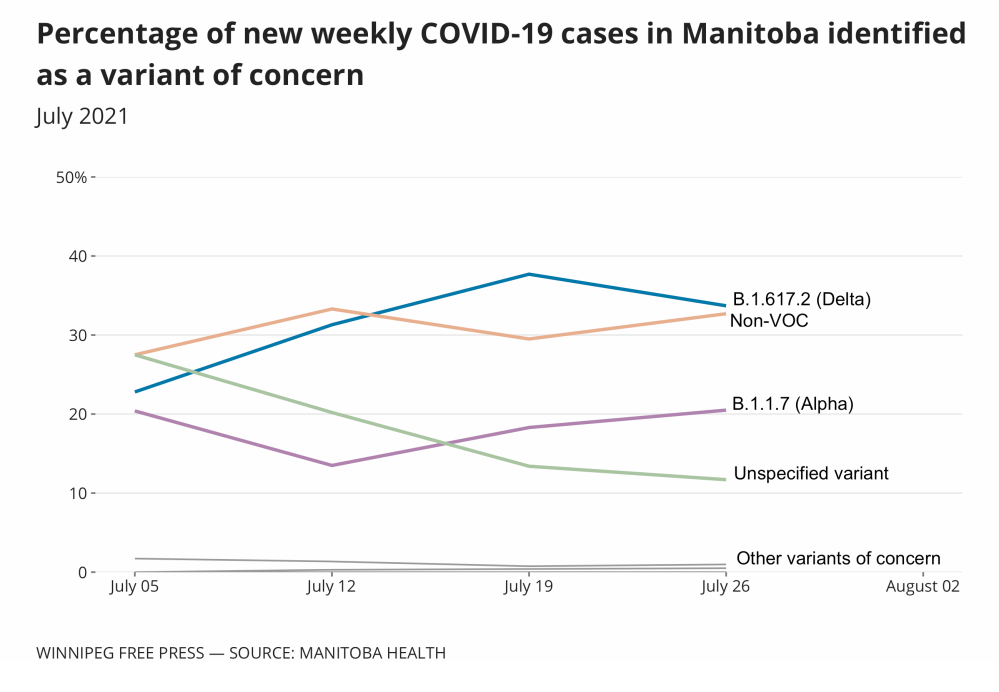 During the final week of July — the most recent data available — Delta (B.1617.2) made up 33.7 per cent of all COVID-19 cases reported in Manitoba, causing more infections than the Alpha variant (B.1.1.7), which fuelled the devastating third wave.