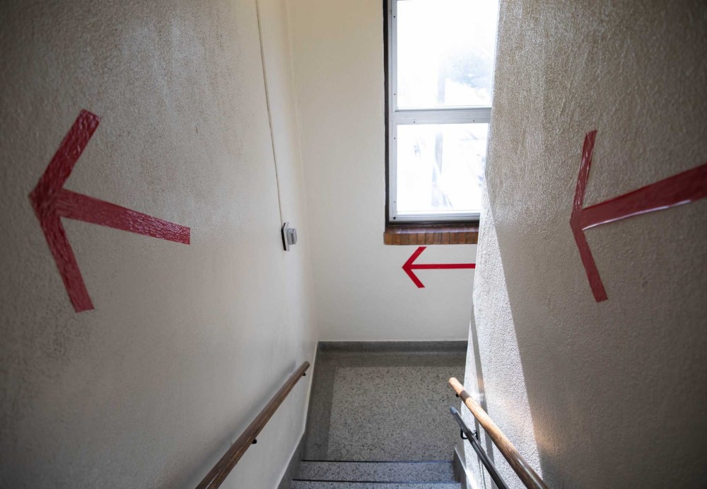 Inside the building, red arrows are taped onto hallway walls to encourage distancing between directional flows, and student desks are spaced one metre apart. The library is a homeroom, and the gymnasium has been converted into two classrooms for older pupils.