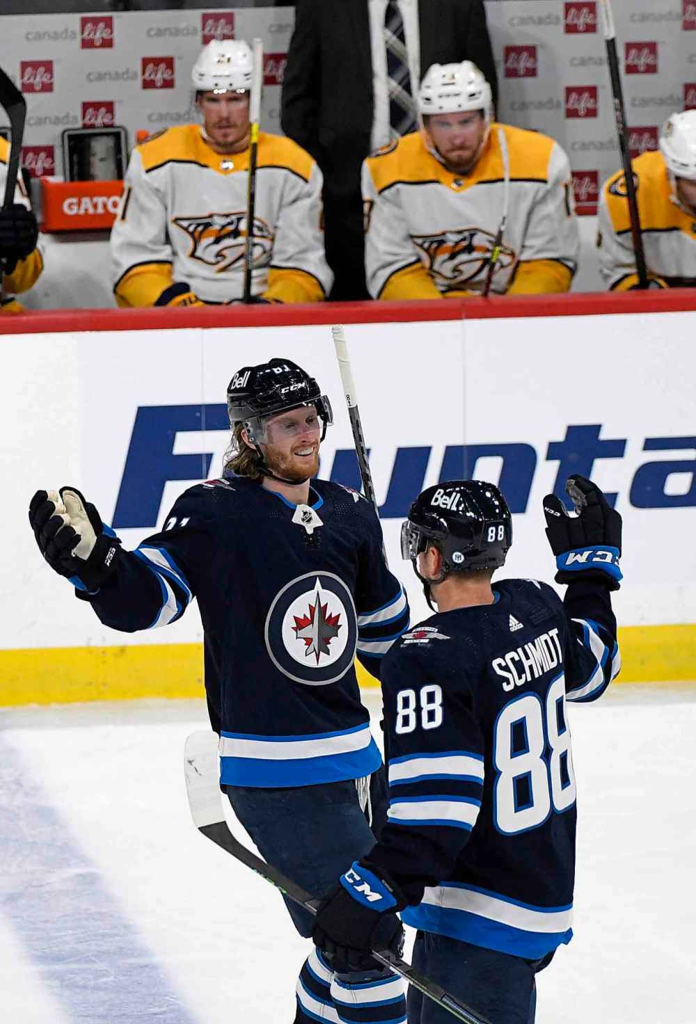 Winnipeg Jets' Kyle Connor (81) celebrates his goal against the Nashville Predators with Nate Schmidt (88) during the third period. (Fred Greenslade / The Canadian Press)