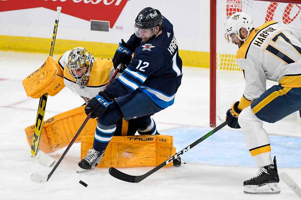 CP Winnipeg Jets' Jansen Harkins (12) tries to get loose puck in front of Nashville Predators goaltender Juuse Saros (74) and Ben Harpur (17) during the second period. (Fred Greenslade / The Canadian Press)