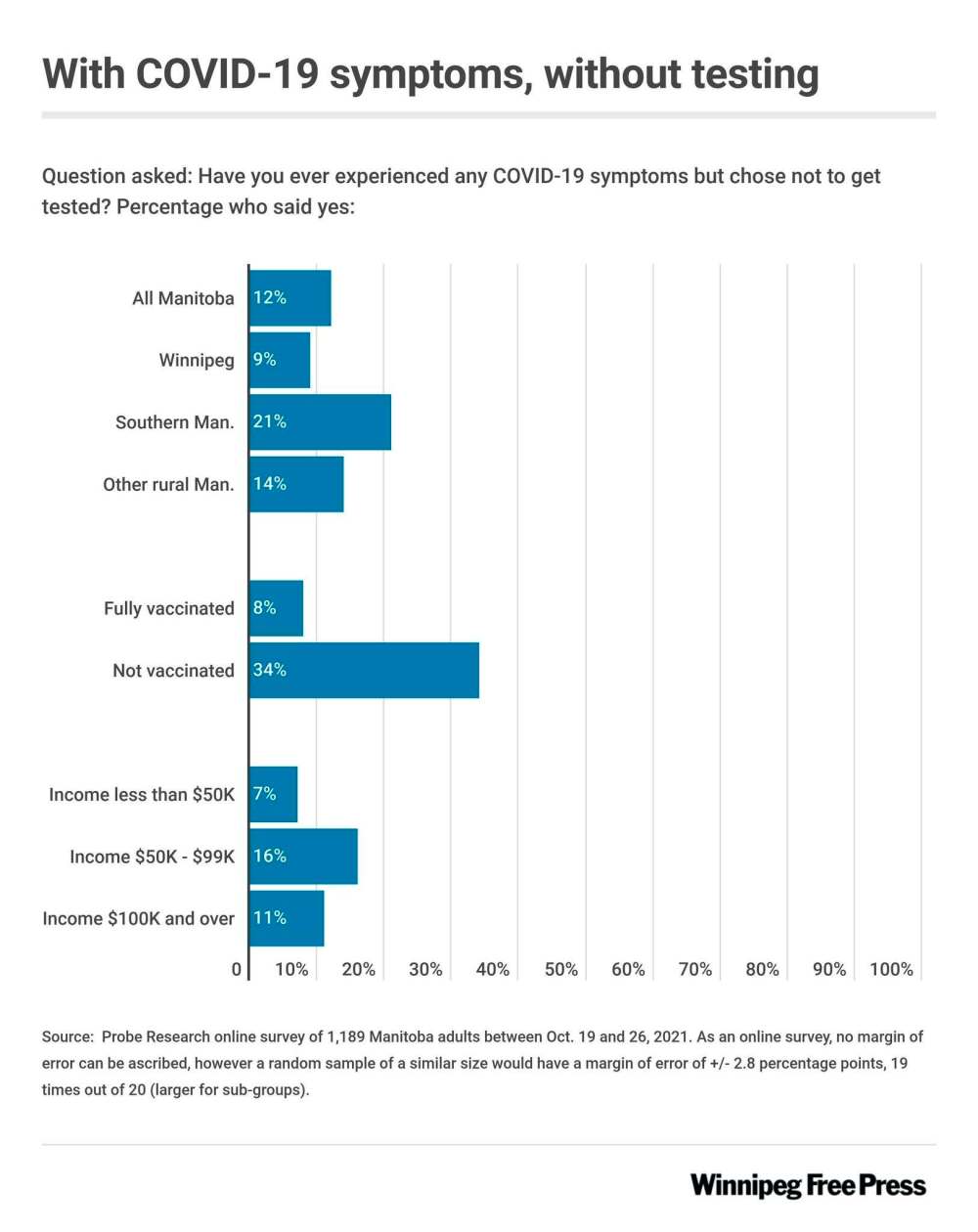 A total of 21 per cent of southern respondents who had COVID-19 symptoms admitted to not getting tested. Just 12 per cent of Manitobans overall said they hadn’t been tested while symptomatic, compared with nine per cent of Winnipeggers who fell ill.