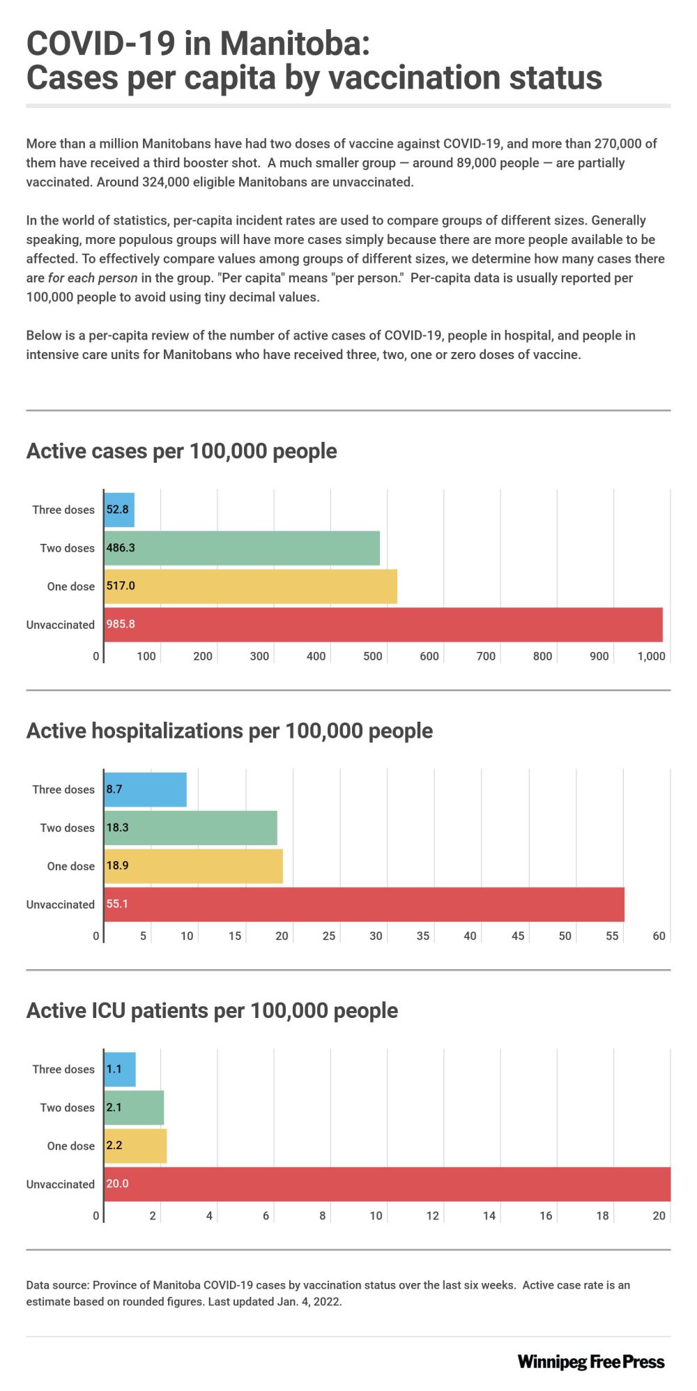 A good place to start would be for Manitoba Health to publish data showing how third doses have reduced the risk of hospitalization and death compared with two shots. Right now, the province compares risk factors on its online dashboard between the fully vaccinated (two doses or more) and the unvaccinated. The risk factors between the two are stark: the unvaccinated are nine times more likely to be hospitalized and 26 times more likely to end up in an ICU than those with two doses or more. They are 17 times more likely to die from the disease.