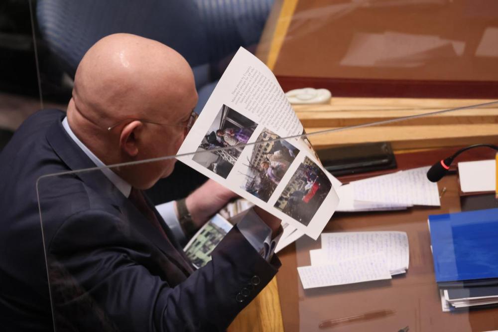 Ambassador Vasily Nebenzia, permanent representative of the Russian Federation, holds documents as he speaks during the U.N. Security Council meeting discussing the Russian and Ukraine conflict at the United Nations Headquarters on March 11, 2022 in New York City. The U.N. Security Council met at Russia's request to discuss Russia's claim of U.S.-supported chemical and biological weapon labs in Ukraine. Both Kyiv and Washington have denied the allegations and have called them Russian disinformation.