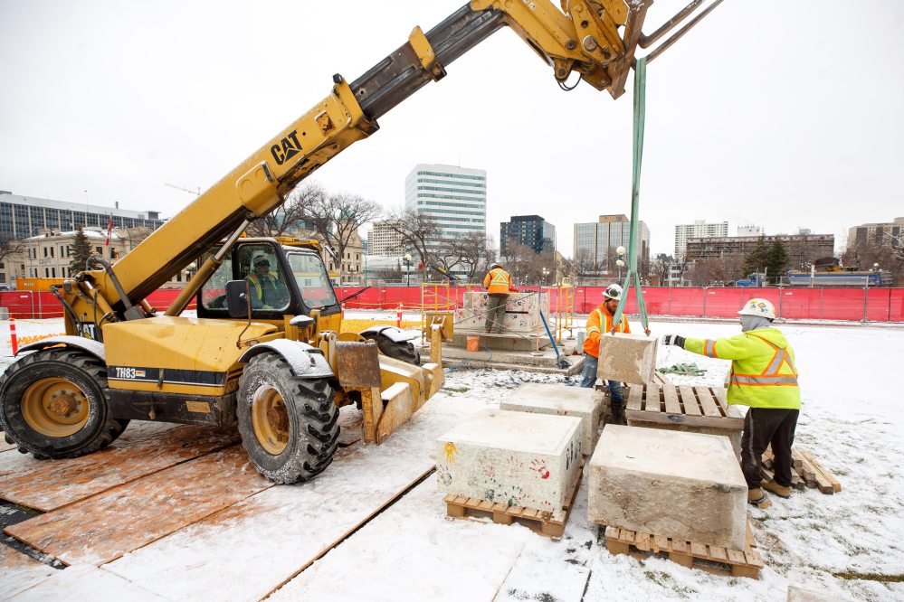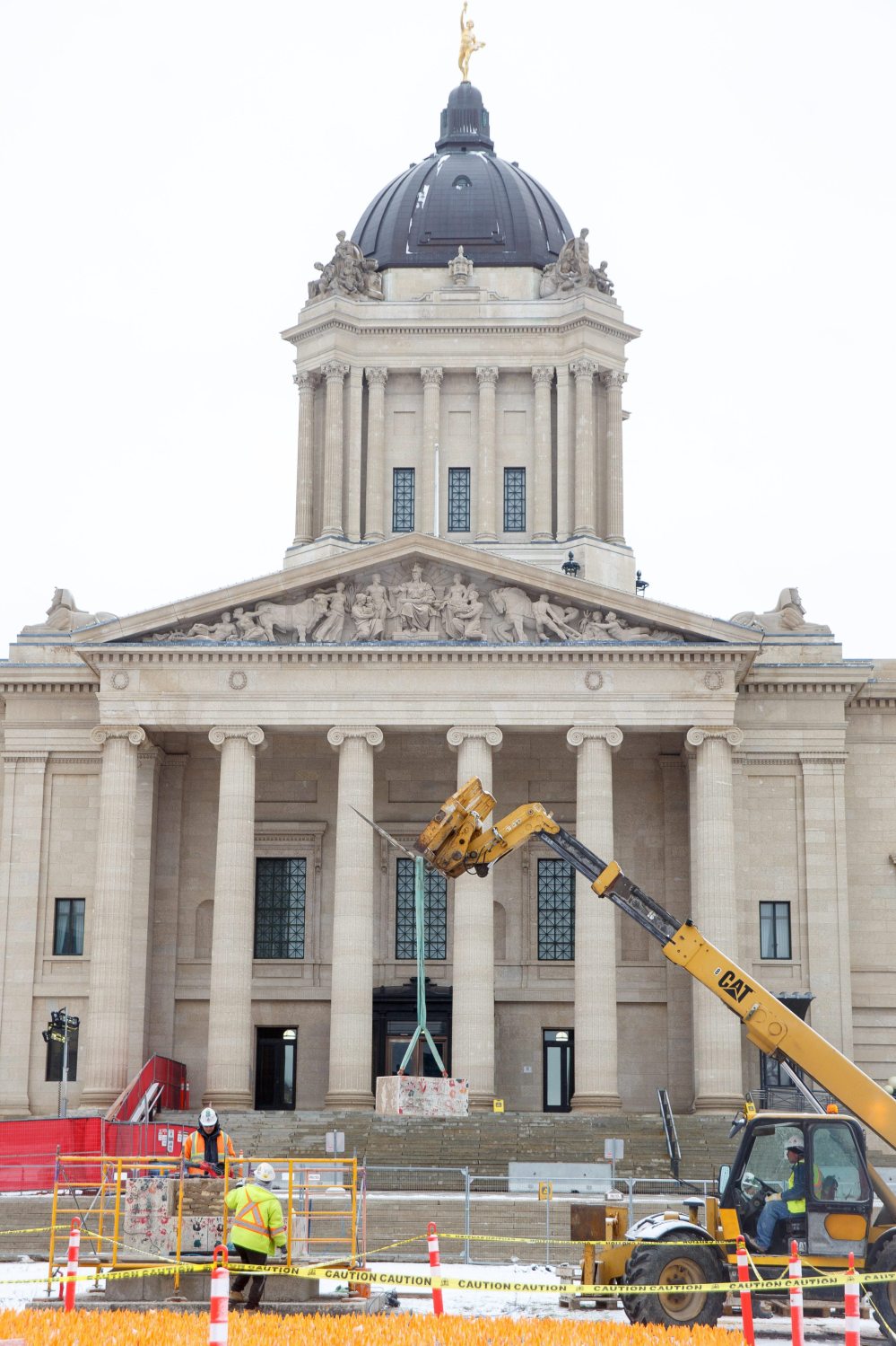 Base from damaged statue on Legislative Building grounds being removed
