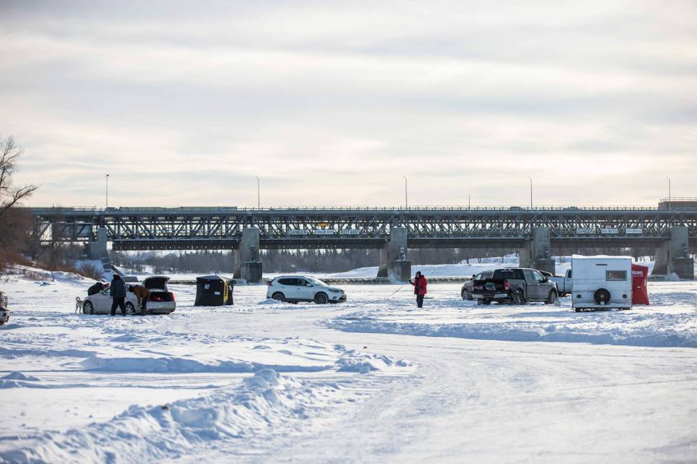 MIKAELA MACKENZIE / WINNIPEG FREE PRESS An ice fishing village, complete with cleared pathways, free Wi-Fi and an ice rink, is set to open in Lockport next week. MIKAELA MACKENZIE / WINNIPEG FREE PRESS An ice fishing village gets set up on the river in Lockport on Friday, Dec. 30, 2022. For Malak story. Winnipeg Free Press 2022.
