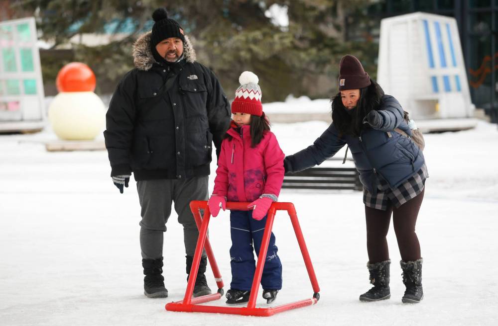 The Ukrainian family visits The Forks weekly to skate. Oryna, 6, sports white figure skates bought second-hand.