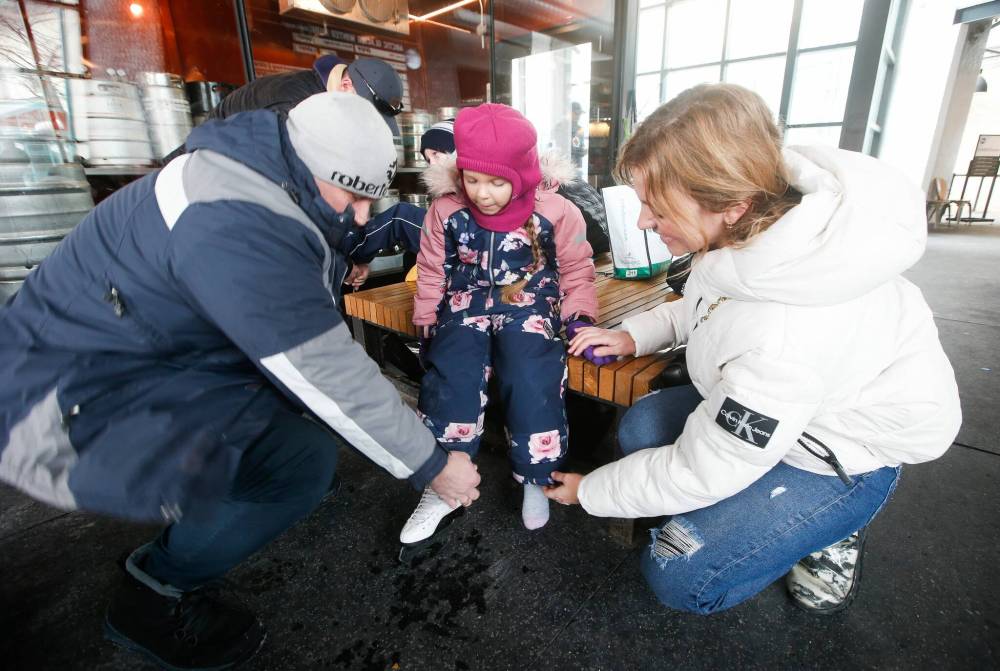 JOHN WOODS / WINNIPEG FREE PRESS Andrii, Oryna and Svitlana Bganka, from Ukraine, get ready for a skate at the Forks on Sunday.