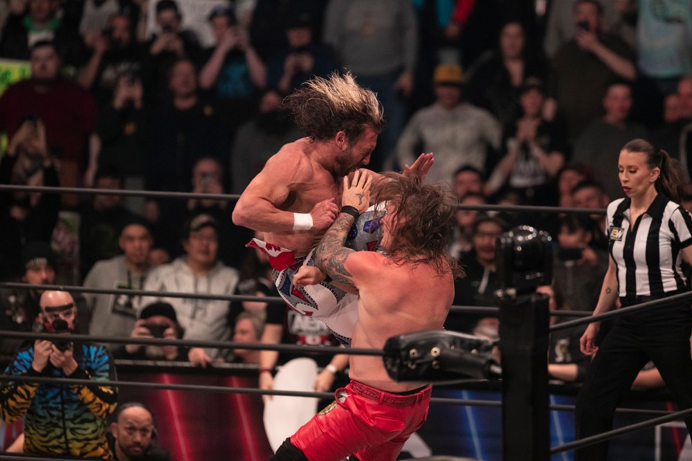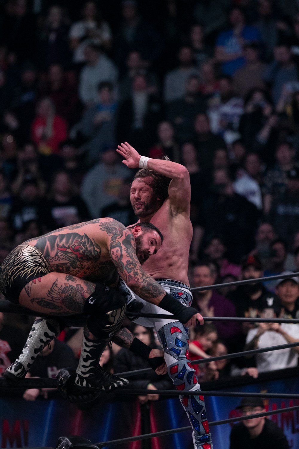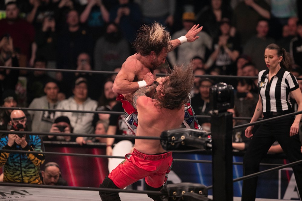 Winnipeg's Chris Jericho (right) battles Winnipeg's Kenny Omega during the All Elite Wrestling Dynamite event at Canada Life Centre in Winnipeg,. Man., on Wednesday, March 15, 2023. (Brook Jones)